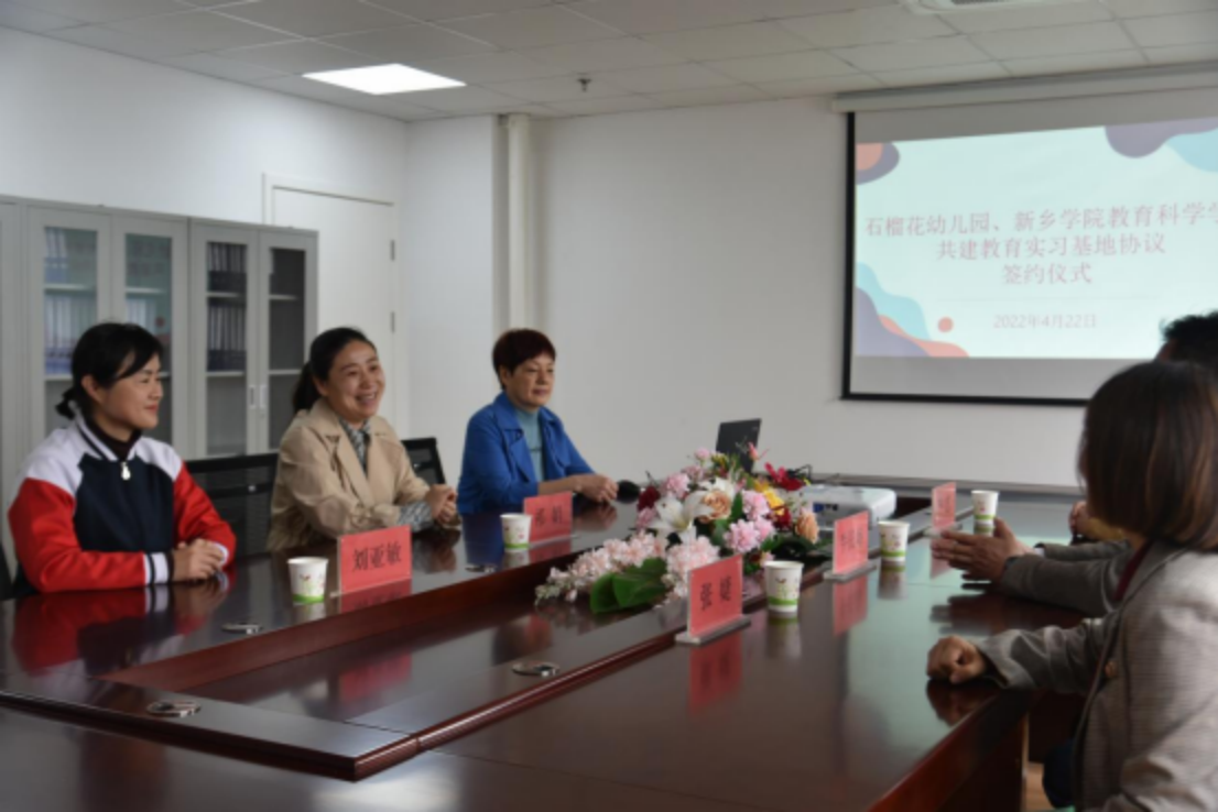 新乡市高新区石榴花幼儿园园长祁娟、行政主任张培红、保教主任刘亚敏等对牛长海一行的到来表示热烈欢迎。祁娟介绍了幼儿园的基本情况、教育理念及发展思路,表示将为教育科学学院学前教育专业的实习生提供观摩、实习及就业的机会与条件,为学前教育专业实习生职业初体验营造美好的工作氛围,并且表示今后双方可以在教学科研、项目申报等方面进行深度合作。牛长海对我院教育实习的基本情况做了说明,交流了疫情防控形势下创新教育实习方式的工作思路,希望以签订实习基地为契机,进一步加深、拓宽高校与实习基地在人才培养方面的合作,为打通培养专业知识精、实践能力强的高素质应用型人才的“最后一公里”持续努力。