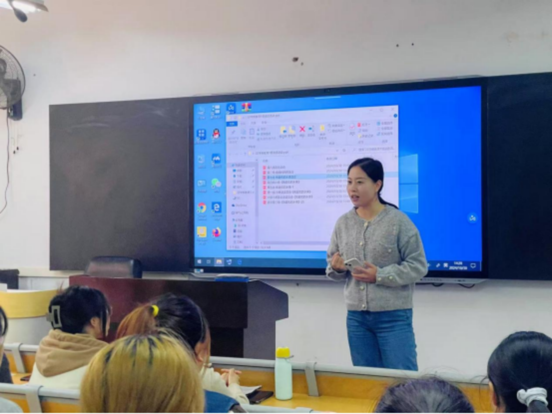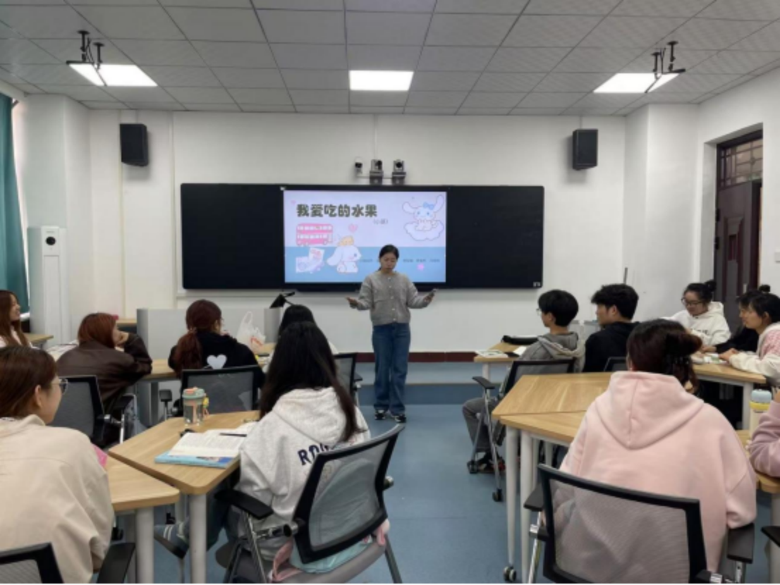 然后,开展模拟教学活动。围绕教学大纲,《幼儿语言课程与活动指导》课程设有课内实践教学环节,为学生提供模拟教学的机会,通过现场观摩、生生互评、教师点评与指导等方式,培养学生设计、准备、组织实施幼儿园语言教育活动的实践能力。本次活动中,学生以组为单位,依次走上讲台,对小组教研过程进行汇报并开展模拟教学。根据每个小组的教学设计与教学实施情况,梁璐从教学设计、教学实施、教学延伸与教学评价等方面给予学生具体指导。