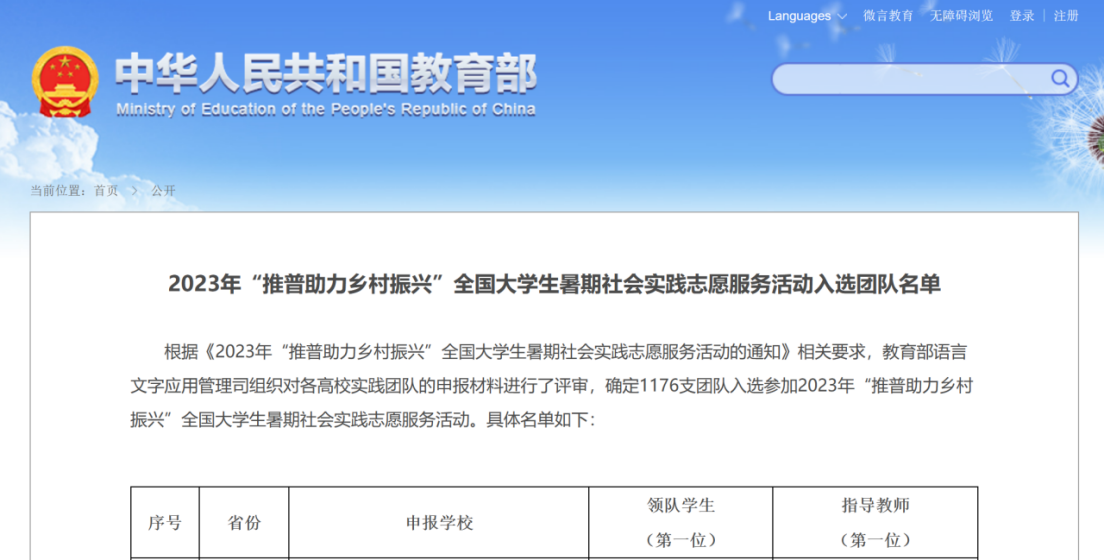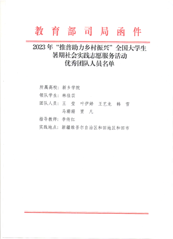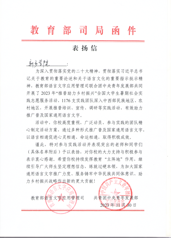 近日,教育部、共青团中央对2023年“推普助力乡村振兴”全国大学生暑期社会实践志愿服务活动进行表彰,新乡学院教育科学学院“‘一字一句普通话,千言万语绘中华’推普疆行实践团”获评全国优秀团队,团队师生受到了教育部语言文字应用管理司和共青团中央青年发展部致信表扬。